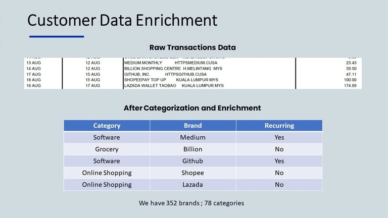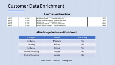 The raw data extracted from bank statement will be enrich and categorize into meaningful data.